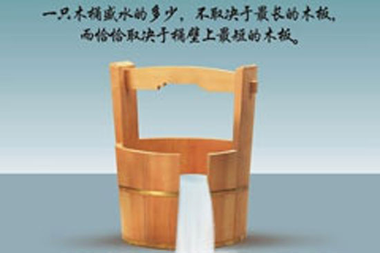 木桶原理又稱短板理論,木桶短板管理理論,所謂“木桶理論”也即“木桶定律”,其核心內(nèi)容為:一只木桶盛水的多少,并不取決于桶壁上最高的那塊木塊,而恰恰取決于桶壁上最短的那塊。根據(jù)這一內(nèi)容,可以有兩個推論:其一,只有桶壁上的所有木板都足夠高,那木桶才能盛滿水。其二,只要這個木桶里有一塊不夠高度,木桶里的水就不可能是滿的。